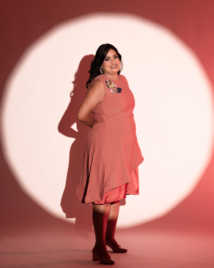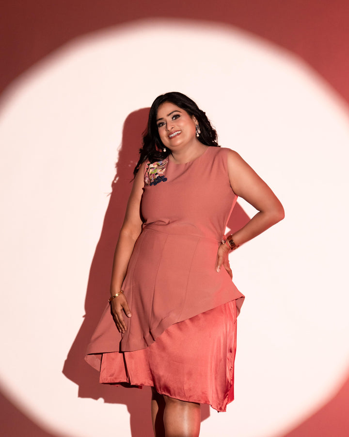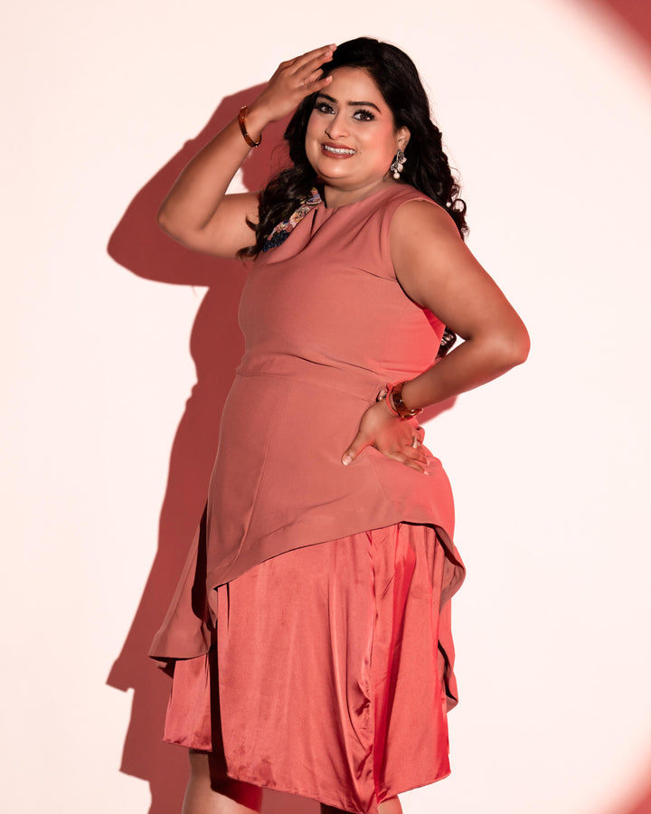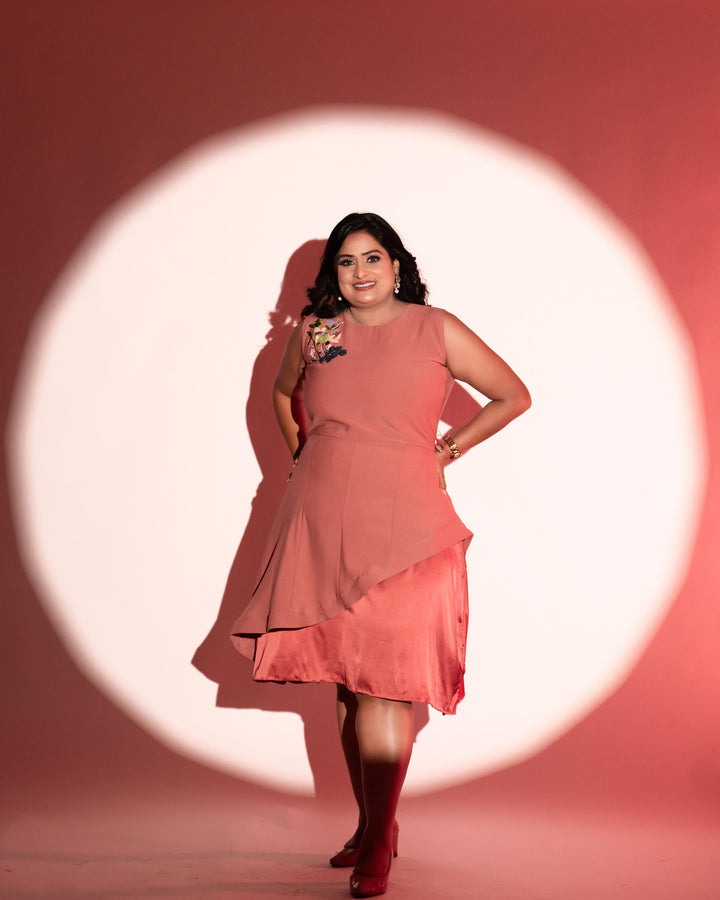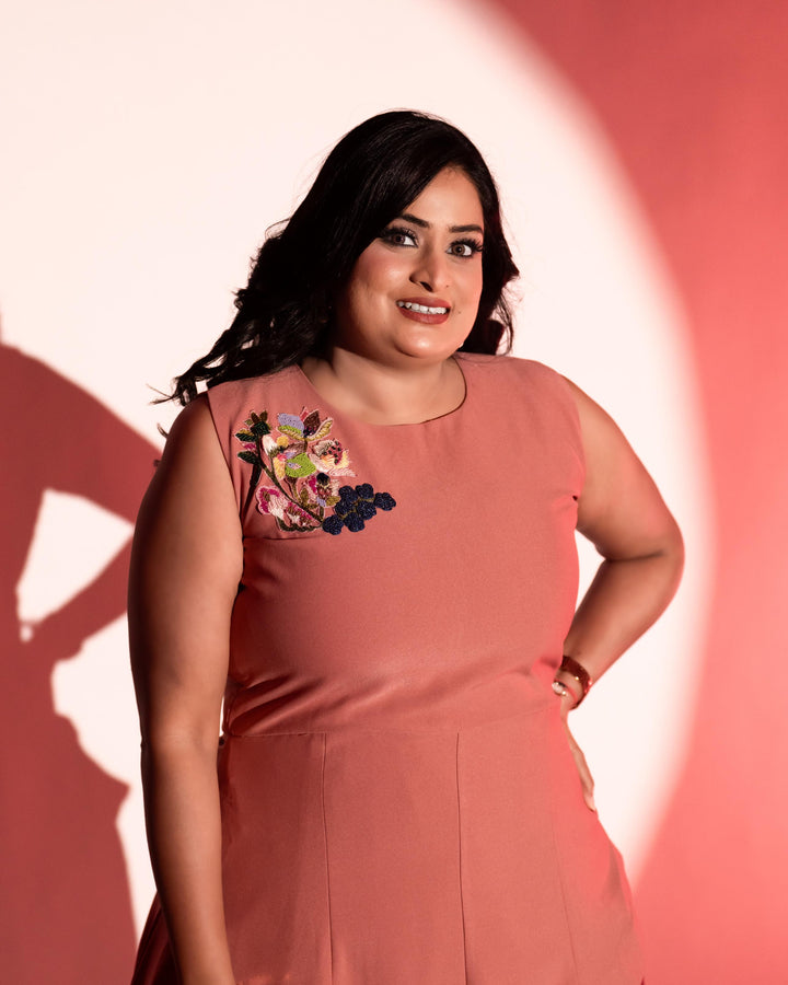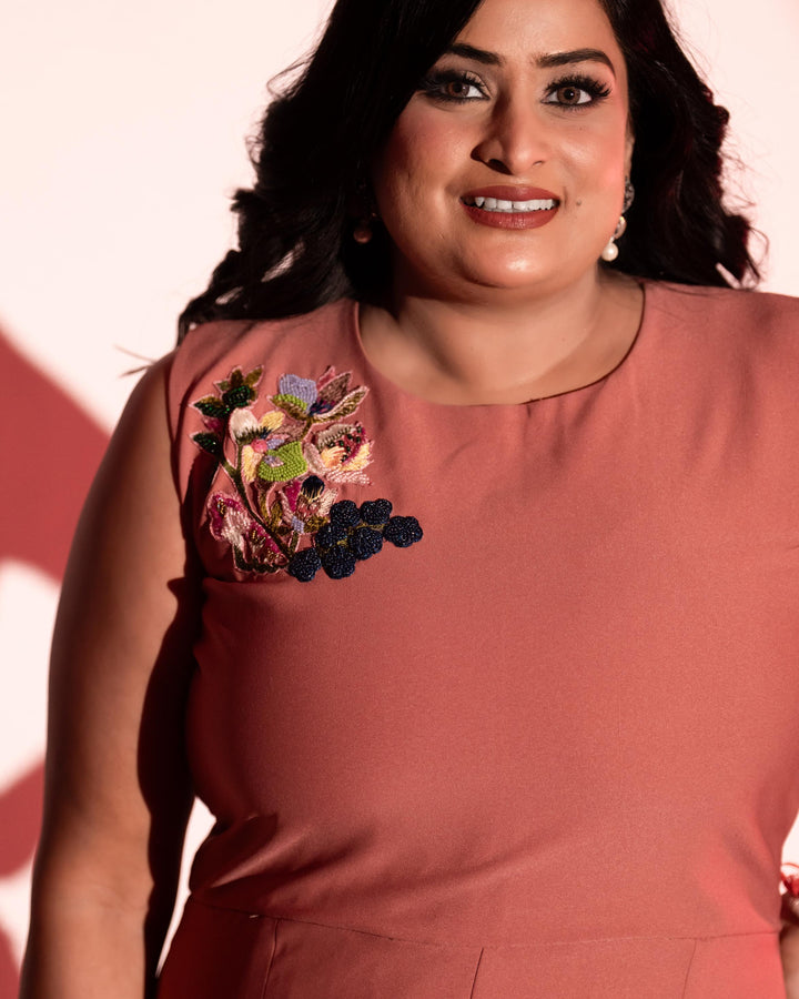 Peach knee length dress with handwork patch on the shoulder and a kowl at the flare