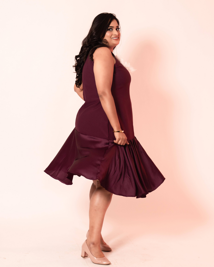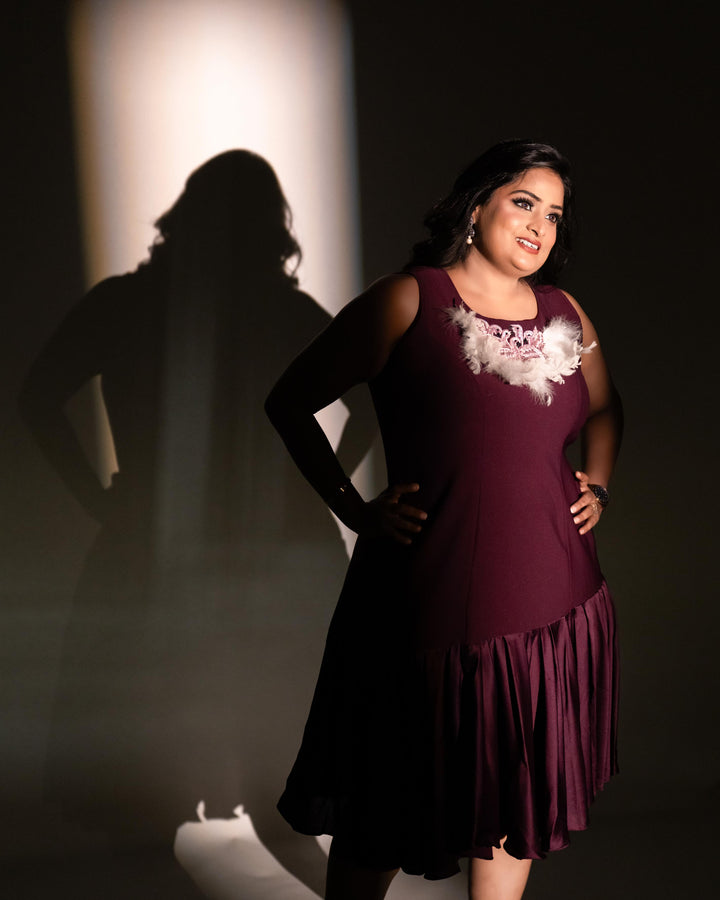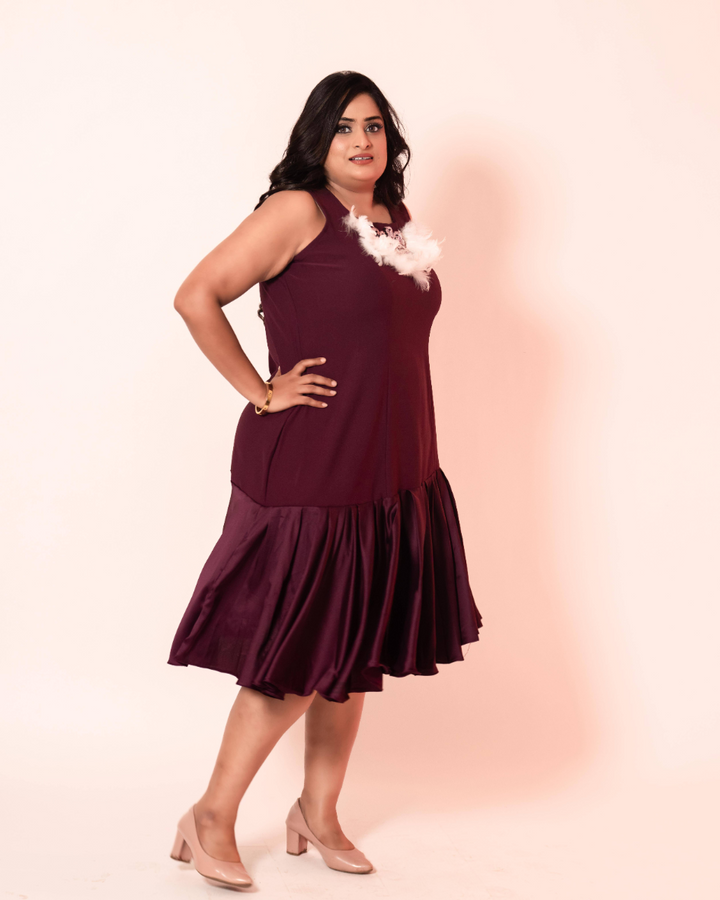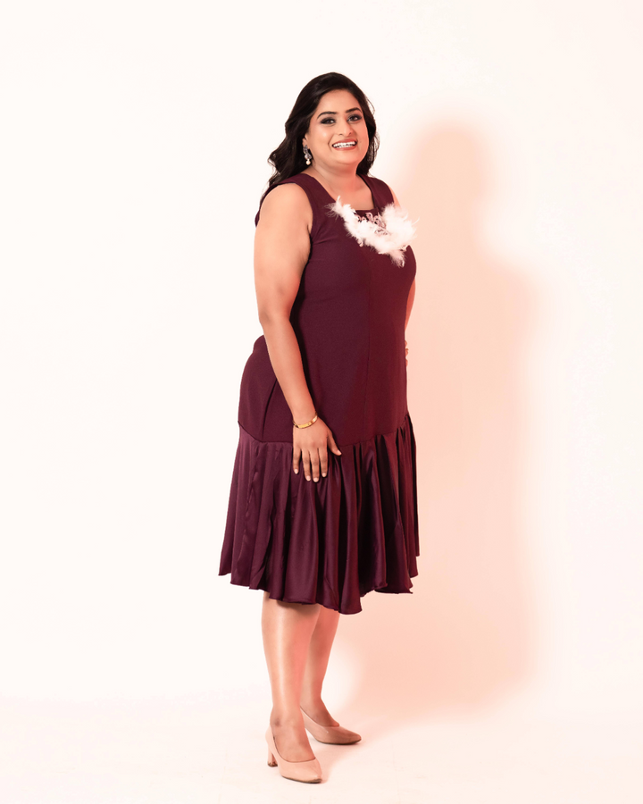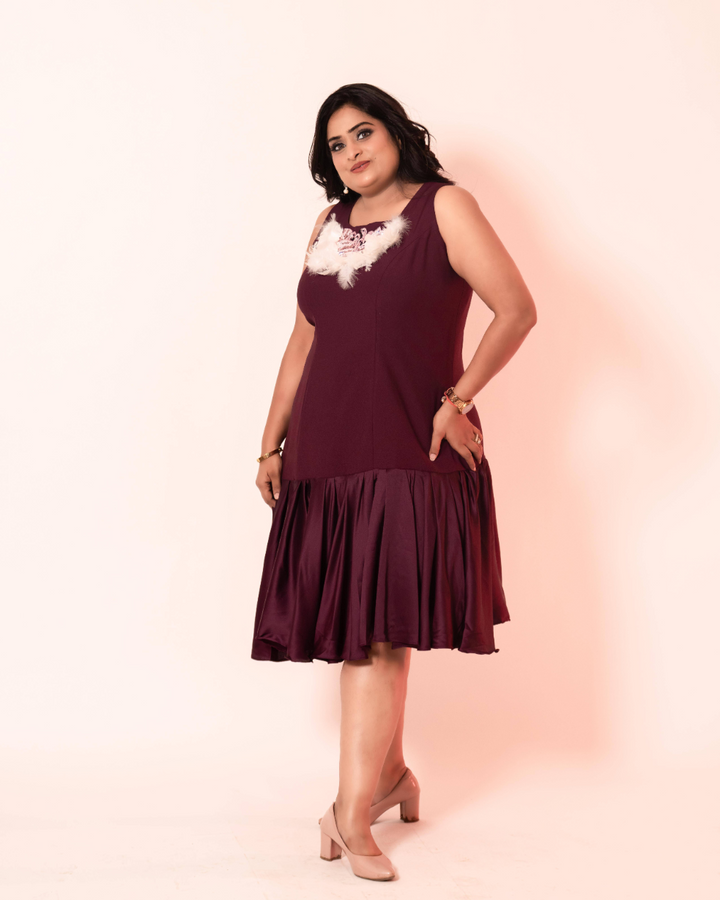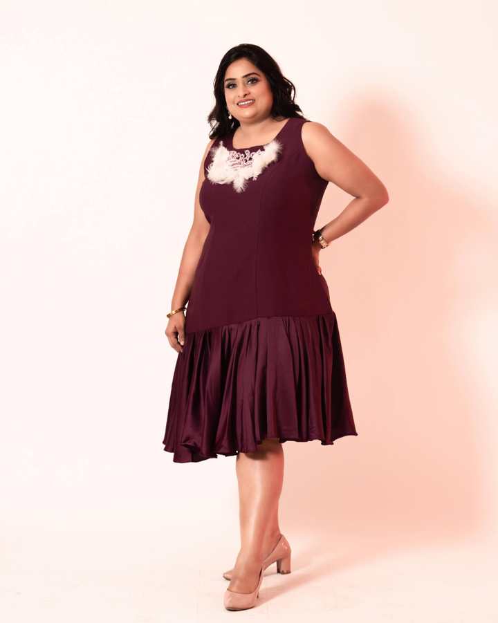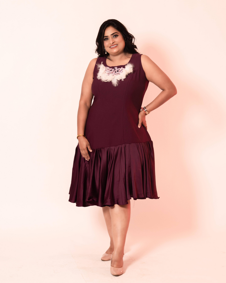 - Purple knee length dress with ruffled flair and hand work patch on neck